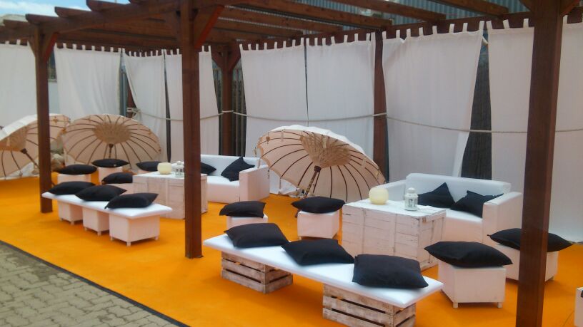Alquiler de sofas, pufs, mesas, lámparas, cojines, parasoles, etc. para zona Chill Out.