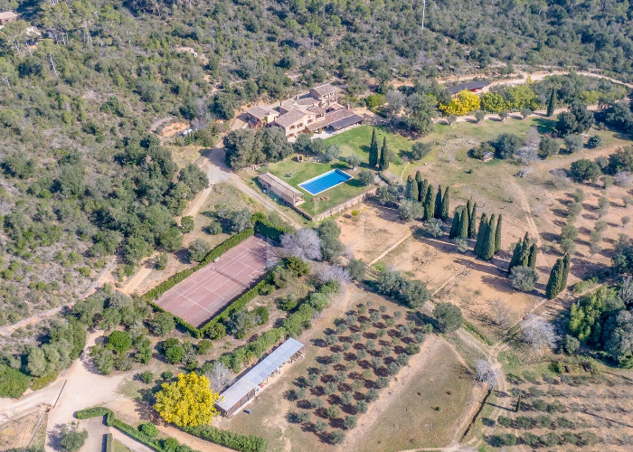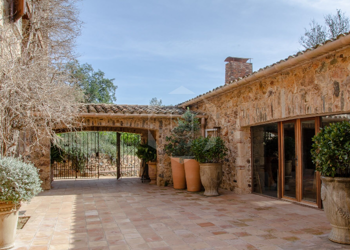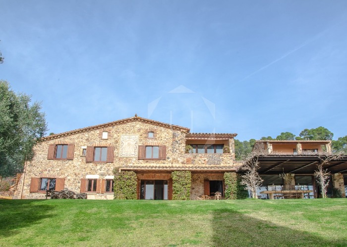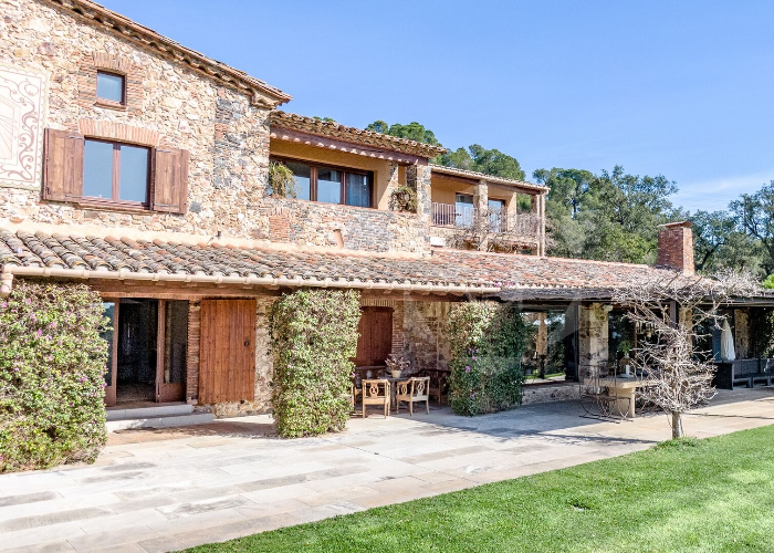 La masía dispone de ocho dormitorios y ocho baños, varios comedores, una cocina completamente equipada, un acogedor patio interior, gimnasio y terrazas con vistas relajantes al bosque.